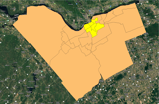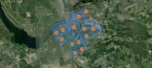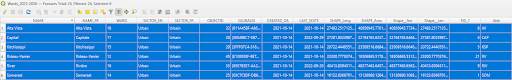 To do so, we will first highlight the wards using the “Select Features” tool in the upper toolbar and holding the Control button while clicking on the key urban wards we will be using in this project. Alternatively, you could also use the “Select Features by Value” tool here if you prefer. For the purpose of the project, these wards will include Capital, Kitchissippi, Alta Vista, Rideau-Vanier, Somerset, and River. These wards can be seen in the screenshot below, but if you’re unsure if you have picked the right polygons, open the attribute table and verify your selection.
