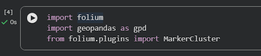 Figure 18. + Code icon and the necessary code to load GeoPandas, folium, and the marker cluster plugin.
