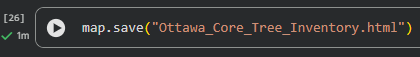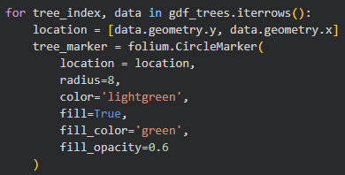 In addition to these steps, we will also create our tree icon that will represent each tree when the map is fully zoomed in. For this tutorial, we will use the folium.CircleMarker() command which allows for the creation of customized markers. The default folium.Marker() also works, but can result in errors with what information will be displayed when selecting a popup. Remember to enter the coordinates variable within the parentheses so that the icon is correctly oriented. The CircleMarker command requires some additional details for the customization to appear properly, which you will see below. These mostly correspond to settings that will affect the symbology of the marker, including radius, colour, opacity, etc. If you wish to learn more about CircleMarkers, you can click here for Folium’s official documentation on them. Once the map is rendered, you should go back and try playing around with different visual settings until you find symbology that you like.