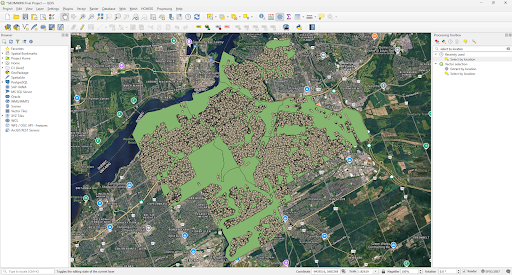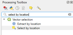 Next, use the search bar in “Processing Toolbox” to search for the select by location tool, it should appear under “Vector Selection”.