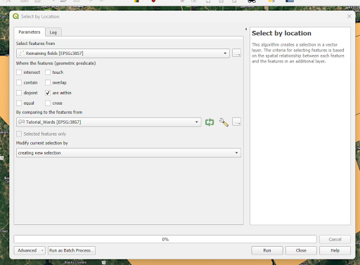 Open the tool and fill out the fields so that we are selecting features from our “Remaining fields” layer that “are within” our three “exported urban wards” layer. It should look something like the screenshot below: