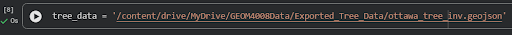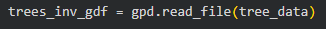 Next, we have to use GeoPandas to properly load our tree data GeoJSON file so that it can be read. To do so, we will turn the data into a GeoDataFrame with the code gpd.read_file(). Again, you’ll have to pick a variable name and tailor the code to the name you’ve given the tree inventory data, but it should resemble something like this: