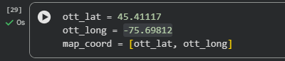 Next, you will have to set the webmaps coordinates that it will load into automatically. To do so, you must first pick three variable names that will be used for the rest of our work in Google Colab. The first will represent Ottawa's latitude (45.41117), the second will be the city’s longitude (-75.69812), and the final variable will contain both of these values. You can decide how you want to name your variables, but the structure should look similar to below: