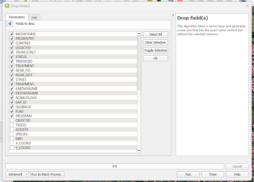 This will open a table with all the columns for the tree inventory. From here, you just simply select all columns that are not our key fields that we identified earlier.