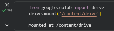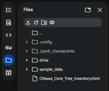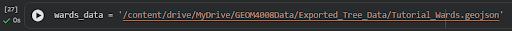Next, you will have to import your QGIS cleaned tree inventory data to a Google Drive, mount your drive within Google Colab, and access the necessary files. The following code will achieve that, but always remember to hit the play button after to ensure the code runs before moving on to the next step. Navigate through the authorization windows that open and then open another code box.