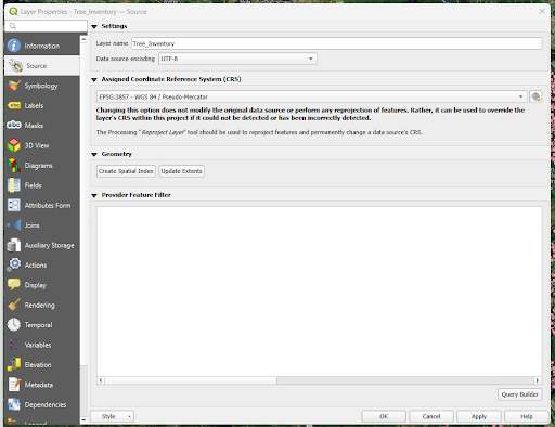 Before moving on, ensure that the points line up over Ottawa correctly and double check it has the correct assigned coordinate reference system by opening the source tab in the layer properties. It should look like this: