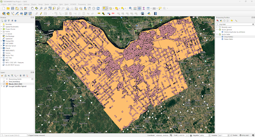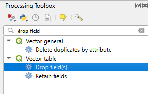 To delete all other columns, you will first open the “Processing Toolbox” by clicking “Processing” on the upper toolbar and selecting “Toolbox”. This will open a window on the right side of QGIS, in the search bar enter “Drop Field” and select the option that appears under “Vector Table”.