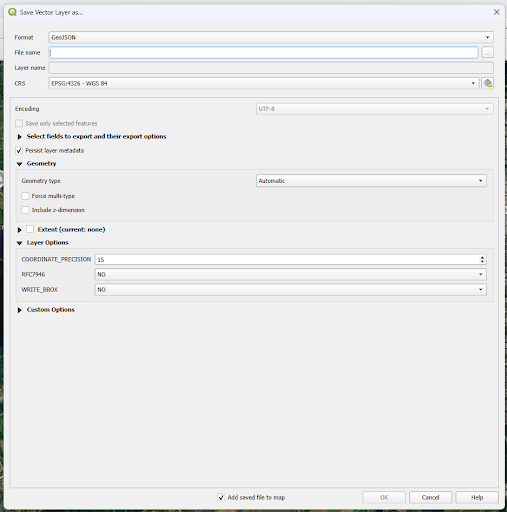 Ensure that the files are exported to the same location as the rest of your data, with a recognizable name, in the correct format. As a final check, ensure that the CRS is still correct in this window.