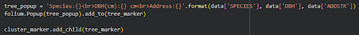 In the following section, we will go over the core piece of code that will process our tree data, create our markers, organize our popups, and then add all of it to the map. To begin, we will start an iterative loop. If you are unfamiliar with this term, it essentially tells Python to go through our GeoDataFrame row by row and index (tree_index) all the information for the current tree in a temporary variable, which we will call “data”.