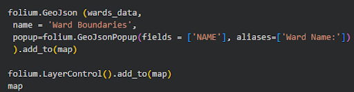 Figure 27. Code to add ward boundary GeoJSON file, layer control, and to produce map.