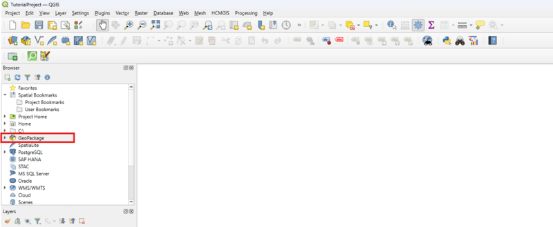 Screenshot showing where the GeoPackage section is in the Browser pane in QGIS.