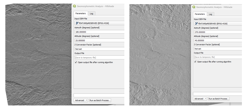 This figure illustrates the effect of varying hillshade parameters on terrain visualization. The left image is generated using an azimuth of 180° and a lower illumination altitude, which enhances valley networks and linear depressions. The right image uses an azimuth of 270° with a higher illumination altitude, emphasizing convex landforms, ridges, and subtle slope transitions. Adjusting hillshade parameters allows users to reveal different geomorphic features and better interpret terrain structure.