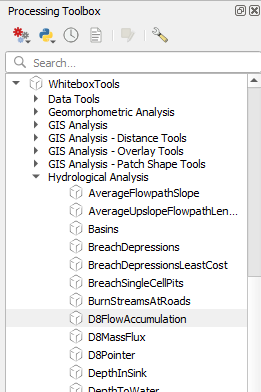 D8FlowAccumulation tool's location in the WhiteboxTools dropdown.