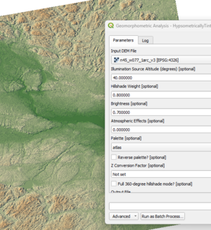 . The illumination altitude parameter defines the height of the virtual light source and influences how shadows are cast across the terrain surface. The hillshade weight controls the balance between the hillshade and the elevation color ramp: higher values emphasize relief and terrain texture, while lower values place more emphasis on elevation differences through color. The brightness option enhances overall contrast, improving the visibility of subtle geomorphic features. Together, these parameters allow the user to produce a clear, visually appealing map that supports both qualitative terrain interpretation and high-quality cartographic presentation.