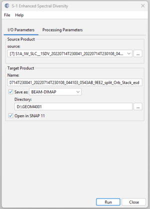 - In the I/O Parameters tab, ensure the file ending with “esd_ifg_deb” is set as the Source Product and run the tool.