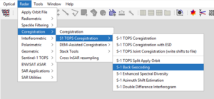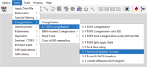- Click Radar -> Coregistration -> S1 TOPS Coregistration -> S-1 Enhanced Spectral Diversity