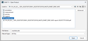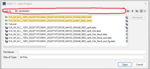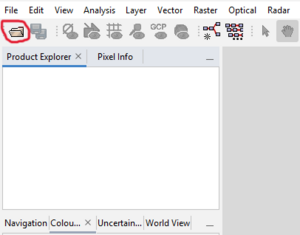 - After launching SNAP, click the folder icon in the top left of the window (Red Outline) or navigate to File -> Open Product. This will open a pop up window.