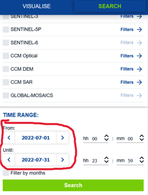- Next, Scroll down and set the time range using the "From" and "Until" drop down calendars (Red Outline Below). An appropriate range should be within a few years of your analysis (e.g. this tutorial made in early 2025 uses images from 2022). If significant changes in the landscape of your AOI have occurred (e.g., earthquake, volcanic eruption, flooding), make sure your data is from after the event. However, when generating a DEM, keep the time range as short as possible. Ideally just days or a few weeks, to avoid inconsistencies caused by natural or human-induced changes in the terrain over time.