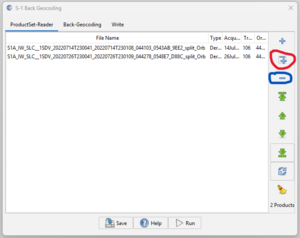 - Add all open files to the ProductSet-Reader by clicking the Add All button (marked in red). Remove the files not ending in “_split_Orb” by selecting them using ctrl+click and clicking the remove button (marked in blue)