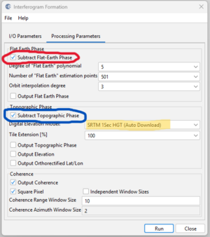 - In the Processing Parameters tab, check Subtract Flat-Earth Phase (marked in red) and Substract Topographic Phase (marked in blue) boxes. The Subtract Flat-Earth Phase function accounts for curvature of the earth, and the Subtract Topographic Phase function uses DEM to reduce impact of topographic variation on accuracy.