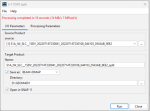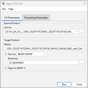 - I/O Parameters: make sure the "_split_Orb_Stack" ending file is the Source Product and run.