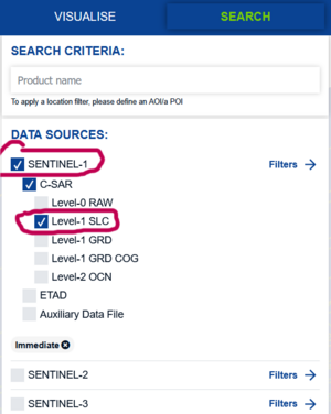 - Once this is done, select both the Sentinel-1 and Level-1 SLC Boxes (Red Outline Below).