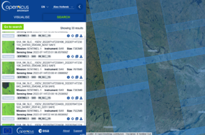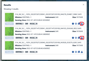 - You can now select an image by clicking on a blue extent that covers your AOI. A pop up window should appear listing the images with that coverage within your time range (See image below). For InSAR, we require two images. Remember that a low temporal baseline (Time between images) will increase the accuracy of you DEM, so selecting two images with the shortest period between captures is suggested.