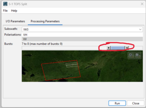 - In the Processing Parameters tab, select the subswath and burst(s) that cover you AOI. The subswath is selected from the dropdown subswath menu, and burst(s) are selected by dragging the arrows (outlined in red) along the bar. The outline of the area of coverage will be shown on the map below in a white outline. At this stage you also select the polarization of the image. Sentinel 1 SAR data comes in HH, VH, and VH polarization, each with its own uses.