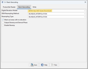 - In the Back-Geocoding tab, select SRTM 1Sec HGT (Auto Download) from the Digital Elevation Model dropdown (highlighted in yellow), then click run at the bottom of the window